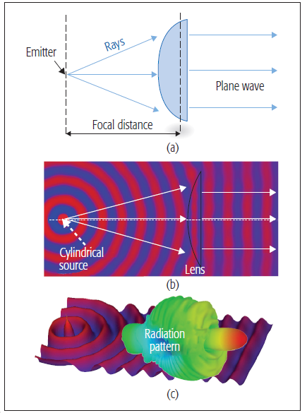 Fig. 1 – Lens Antenna transforming spherical wave fronts in planar ones (plane wave), allowing the enhancement of radiation parameters (high gain and low Side-Lobe-Level)*